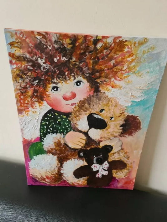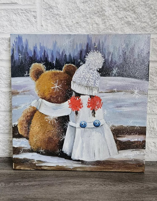 Oil Hand-painting On Canvas of a A Girl And Teddy Bear In Winter