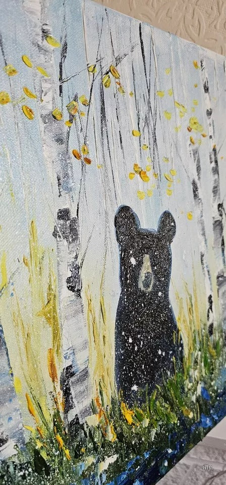 Oil Hand-painting On Canvas of a Bear In Birch Forest And BLUE Flower Field